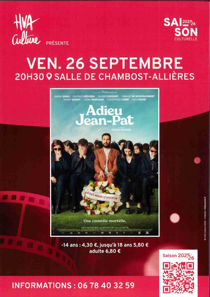 26 septembre, 20h30 : les séances mensuelles de cinéma reprennent à Chambost-Allières ! HVA Culture propose « Adieu Jean-Pat », un film de Cécilia Rouaud.