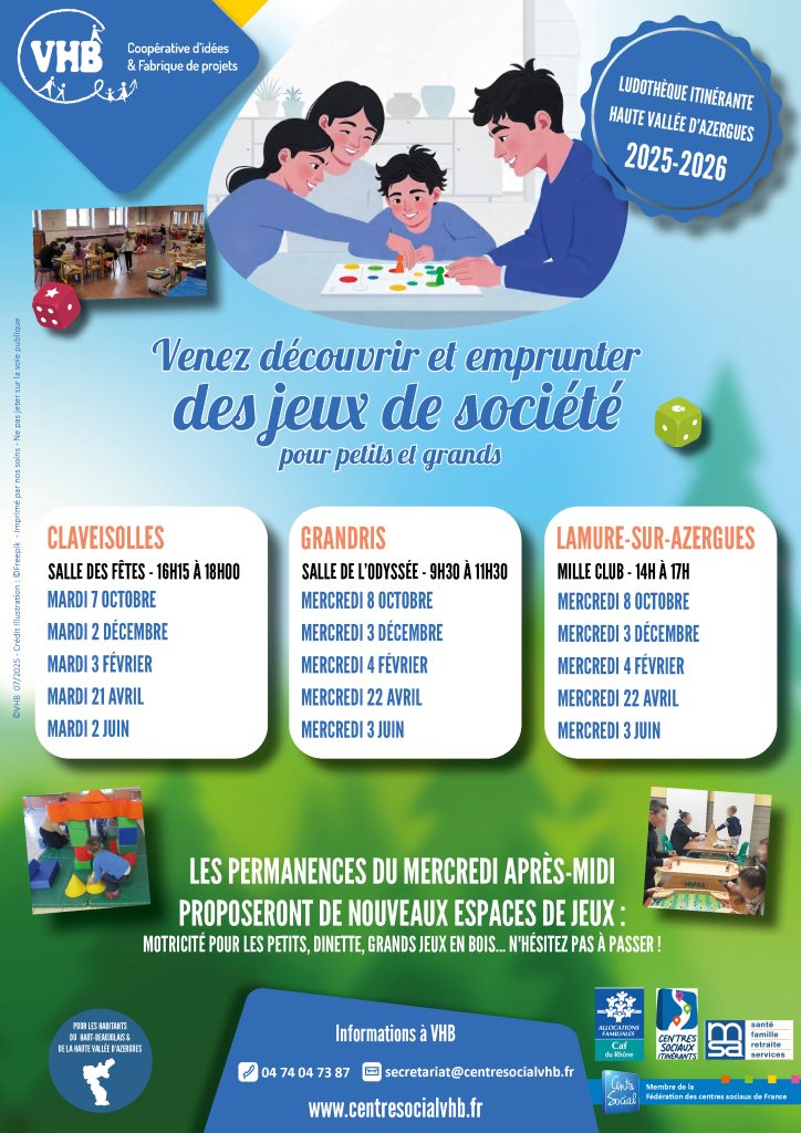 La Ludothèque itinérante de VHB reprend la route, dès le 7 octobre, pour sa tournée 2025-2026. Dès le 7 octobre, découvrez et empruntez une multitude de jeux société à Claveisolles, Grandris ou Lamure-sur-Azergues.