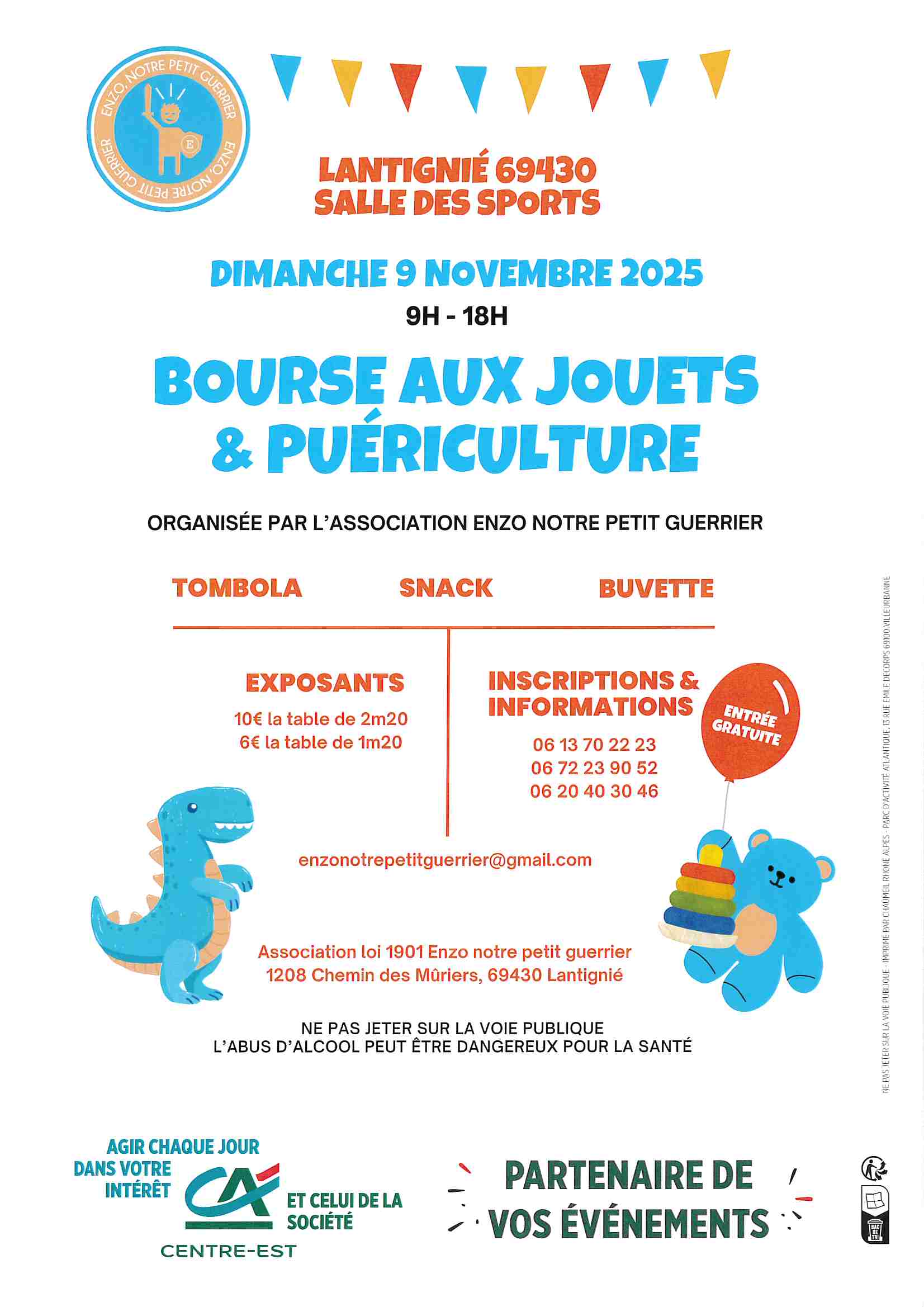 9 novembre : l’association « Enzo, notre petit guerrier » organise une bourse aux jouets et puériculture à Lantignié. RDV à la salle des sports.