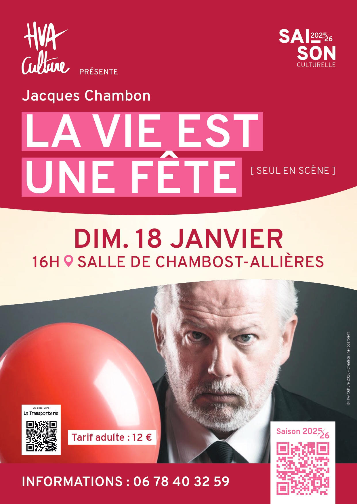 18 janvier à 16h : avec HVA Culture, retrouvez Jacques Chambon pour son seul en scène « La vie est une fête ». C’est noir, c’est grinçant… mais c’est très, très drôle ! Prudent réserver : 06 78 40 32 59.