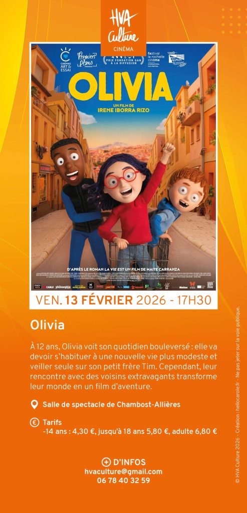 13 février : jour de cinéma à Chambost-Allières ! HVA Culture propose « Olivia », un film espagnol en stop motion de Irene Iborra Rizo.