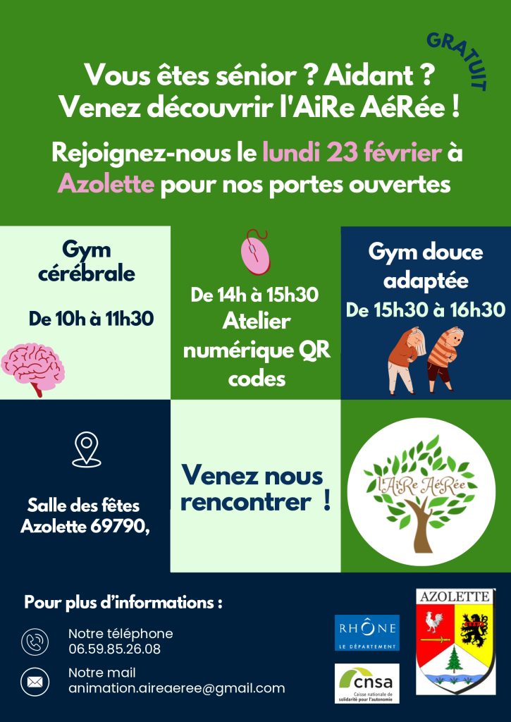 23 février : « l’AiRe AéRée », une association luttant contre l’isolement des séniors et des aidants en milieu rural, sera présente à Azolette pour une journée Portes Ouvertes. Plusieurs ateliers seront proposés aux plus de 60 ans, à partir de 10h.
