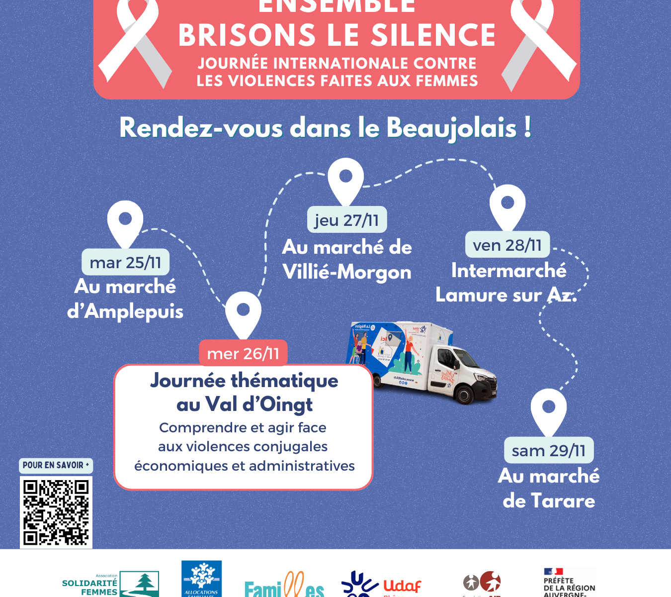 Stop aux violences faites aux femmes ! Le « Bus du Ruban Blanc » sera présent à l’Intermarché de Lamure-sur-Azergues (28 novembre – 15h à 18h) et sur des marchés.