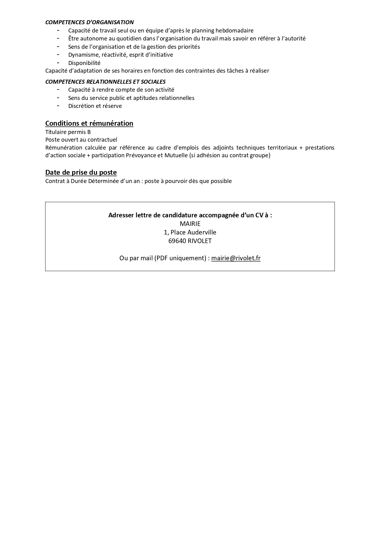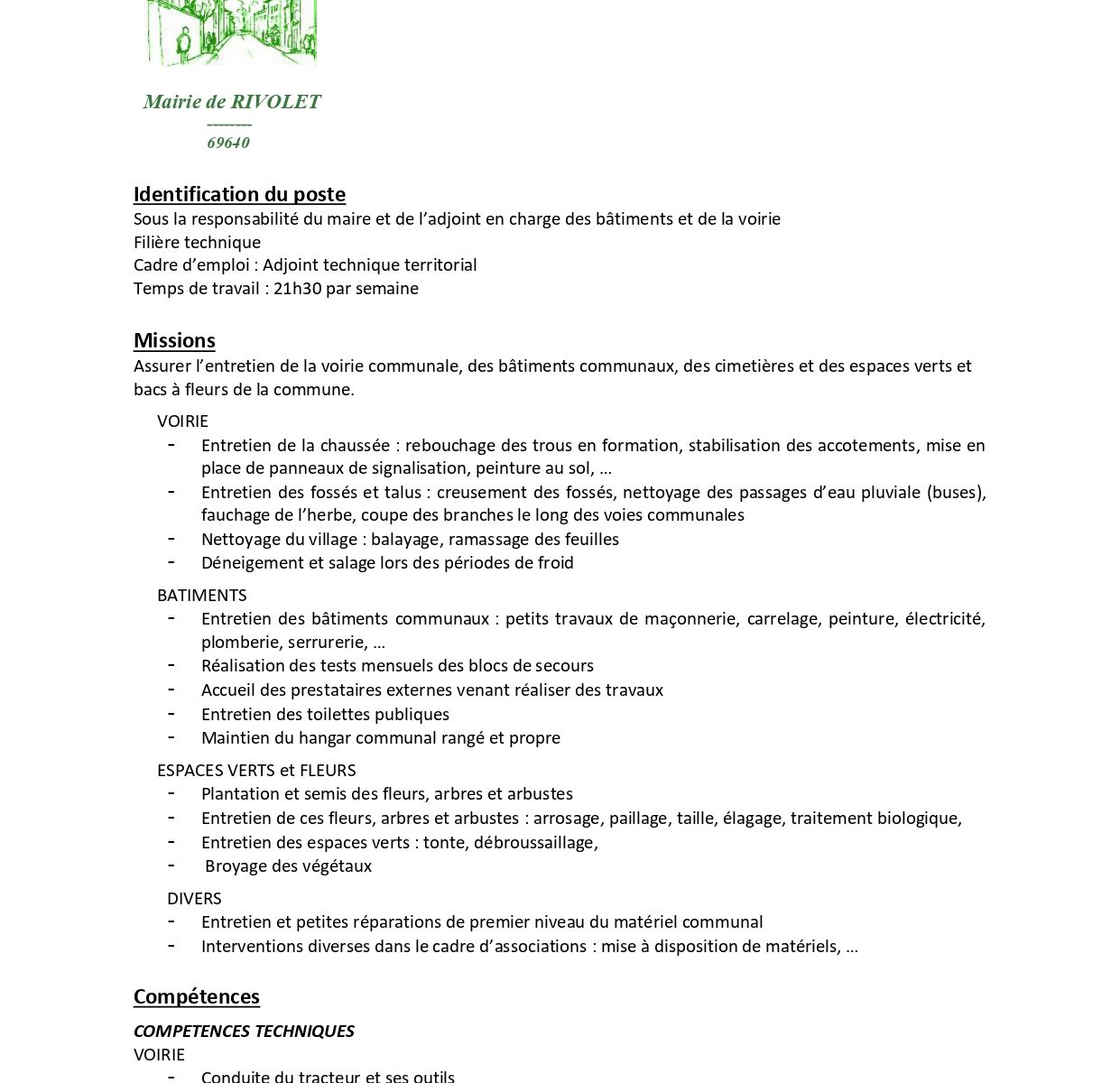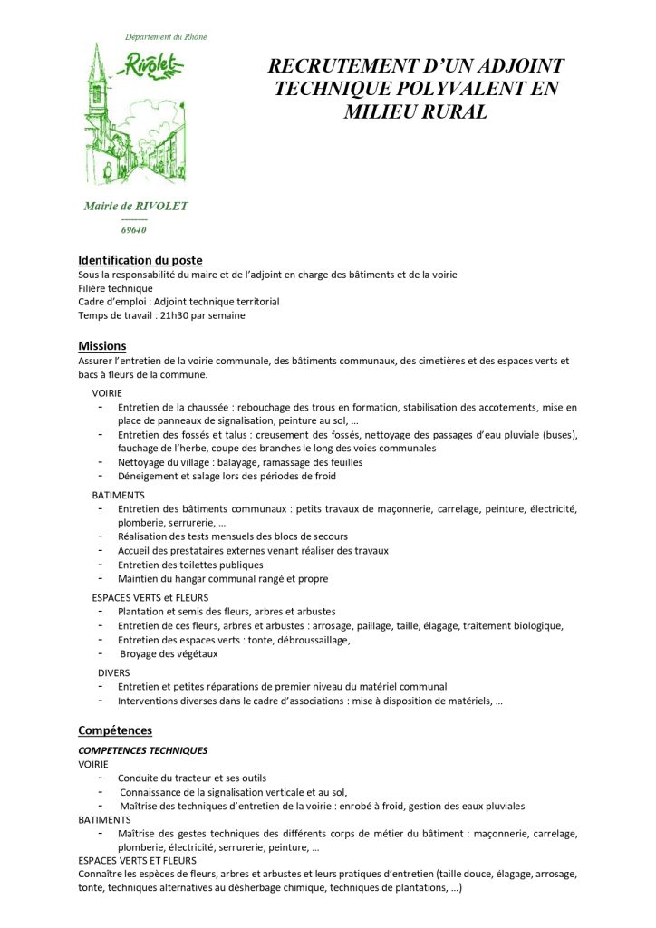 Offre d’emploi : la commune de Rivolet recherche un adjoint technique polyvalent en milieu rural. CDD d’un an à pourvoir dès que possible.