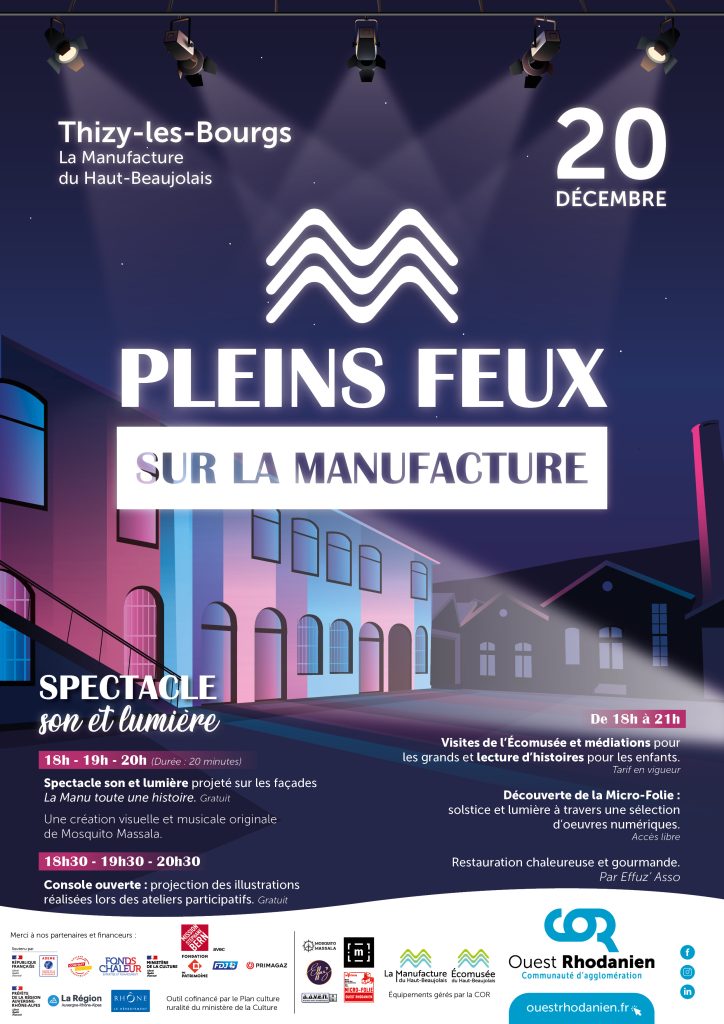 20 décembre : avant sa pause hivernale (21 décembre 2025 – 31 janvier 2026), La Manufacture du Haut-Beaujolais vous convie à une soirée exceptionnelle sous le signe des illuminations. Ses façades seront animées par un « son et lumière » créé par Mosquito Massala et la Micro-Folie proposera une sélection d’œuvres numériques sur le thème du solstice et de la lumière. Vous pourrez également participer aux visites commentées de l’Ecomusée, de 18h à 21h.
