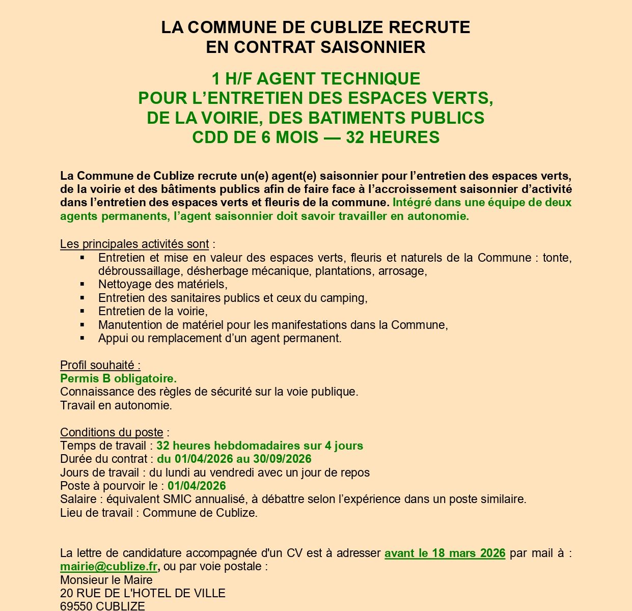 Candidatures avant le 18 mars : mairie@cublize.fr ou par voie postale.