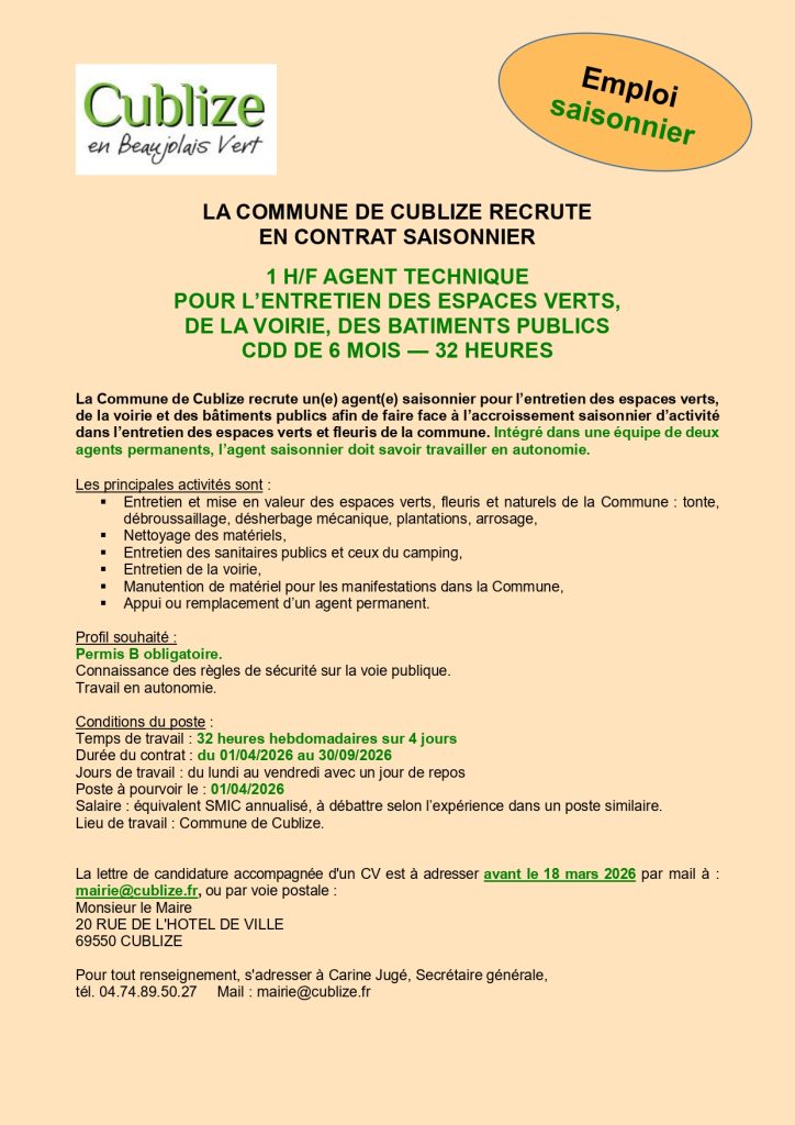 Offre d’emploi – La commune de Cublize recrute en contrat saisonnier un agent technique, à compter du 1er avril.