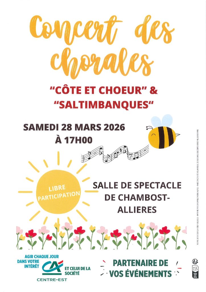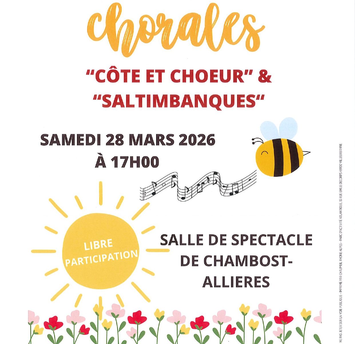 28 mars : concert de printemps des chorales « Saltimbanques » et « Côte et Chœur ». Salle de spectacle de Chambost-Allières, à 17h. Venez nombreux !