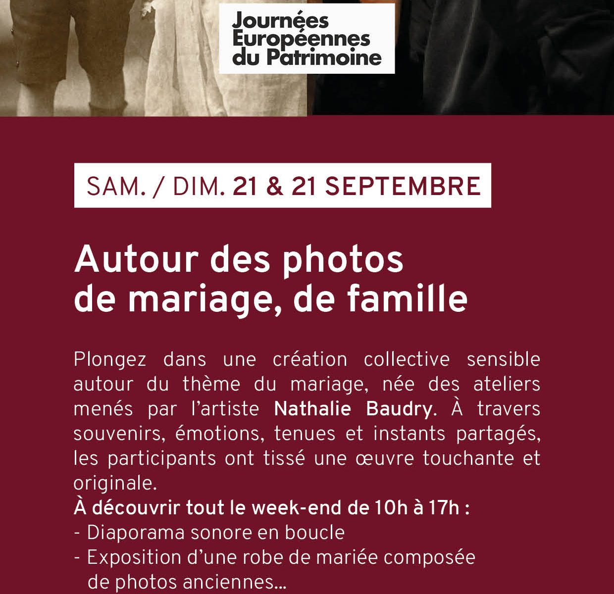 Journées Européennes du patrimoine – HVA présente la restitution du projet artistique mené par l’artiste plasticienne Nathalie Baudry, autour des photos de mariage et de famille :